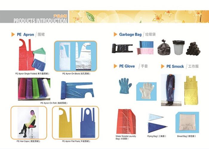 Main Products: Disposable Polyethylene Apron, PE Smocks, Disposable Polythene Gloves, Water Soluble Strip Laundry Bags, Plastic Bags, Seal Garbage Bags, Piping Bags, etc. Our featured product is Disposable PE Aprons.